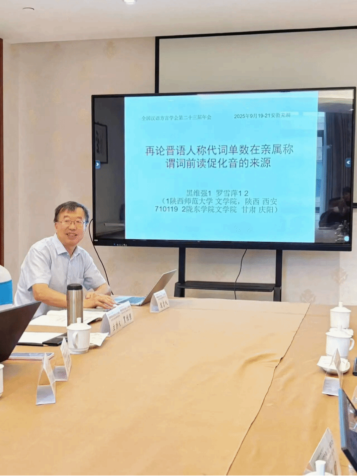 黑维强教授的报告题为《再论晋语人称代词单数在亲属称谓词前读促化韵的来源》(与葡京新集团官网/陇东学院罗雪萍博士合作)。黑教授指出,晋语部分方言中“我、你、他”在亲属称谓前出现促化韵,作主语、宾语时多读舒化韵,二者形成对立。他认为,促化韵主要源于与结构助词“的”的合音,绥德方言表现尤为典型,而山西个别方言(如山阴)出现主语、宾语也读促化韵的情况,则可能是由定语用法类推而来。黑教授强调,合音说具有音理依据和分布对立的事实支持,比语法化解释更能说明促化韵的来源。